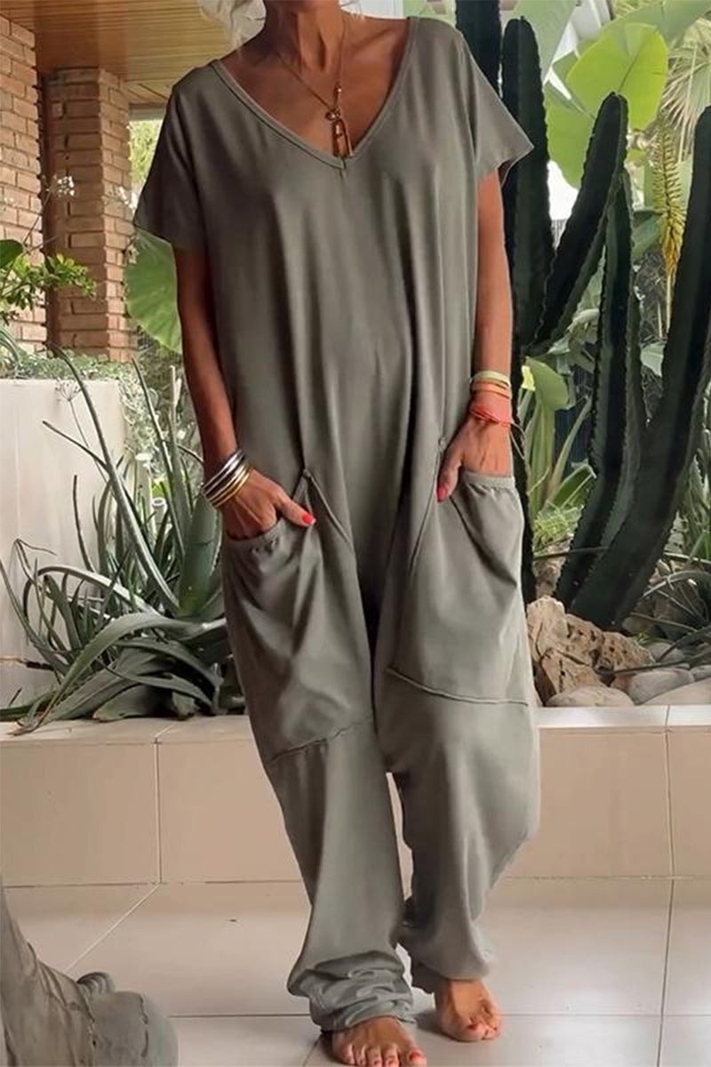Casual Daily Solid Color Pocket V Neck Loose Jumpsuits