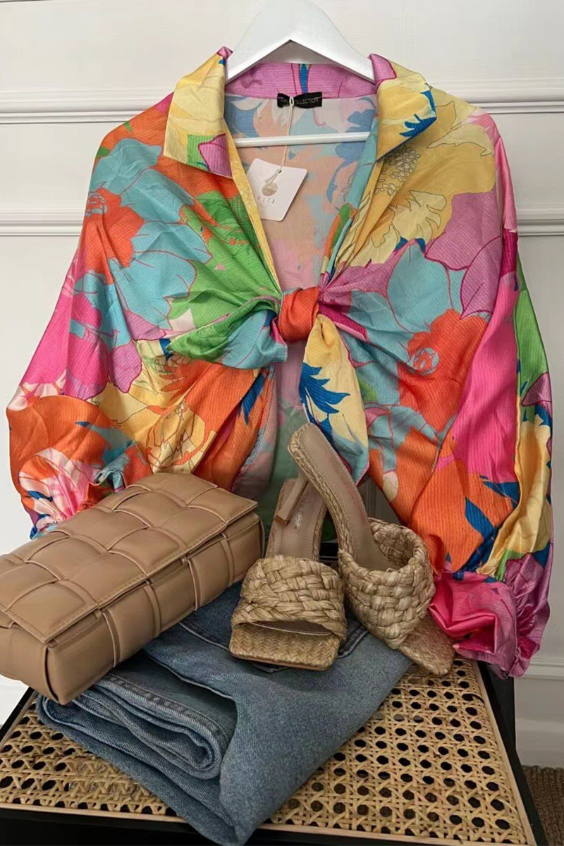 Casual Print Patchwork Turndown Collar Tops(4 Colors)