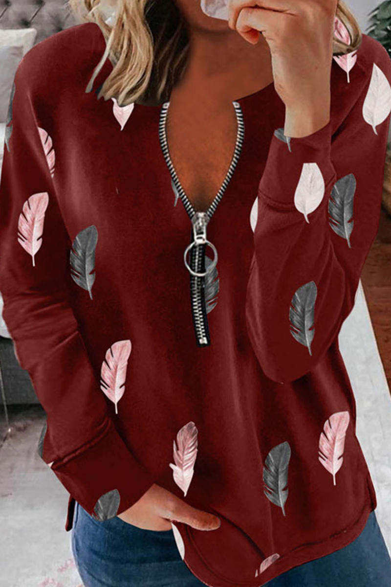 Casual Print Patchwork Zipper Zipper Collar Tops(3 Colors)
