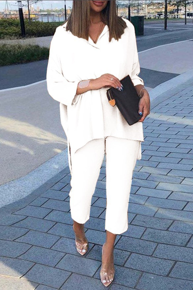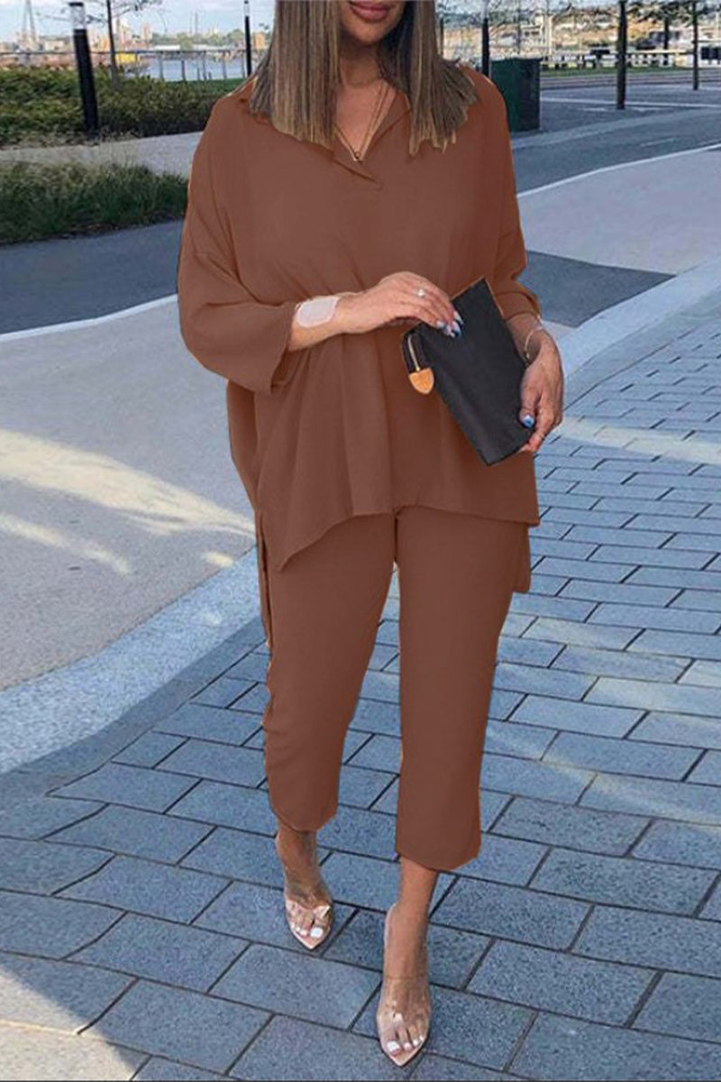 Casual Simplicity Solid Slit Turndown Collar Three Quarter Two Pieces