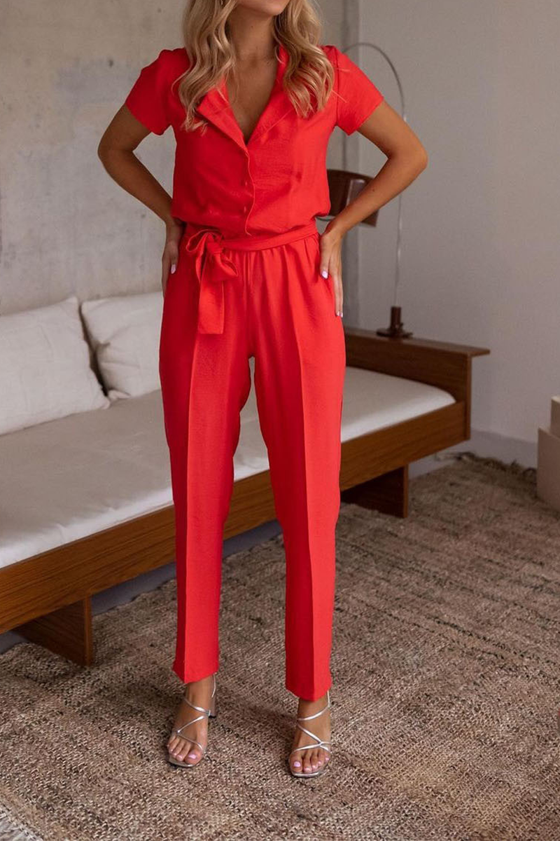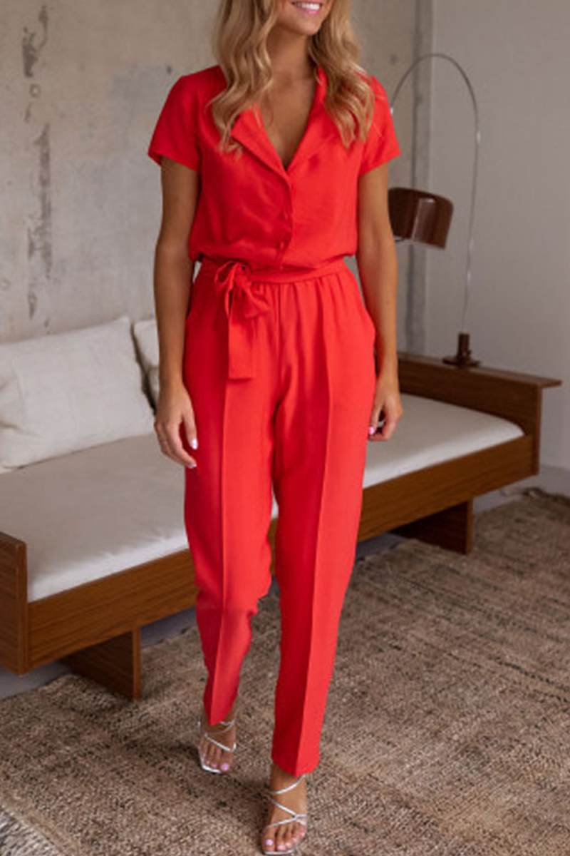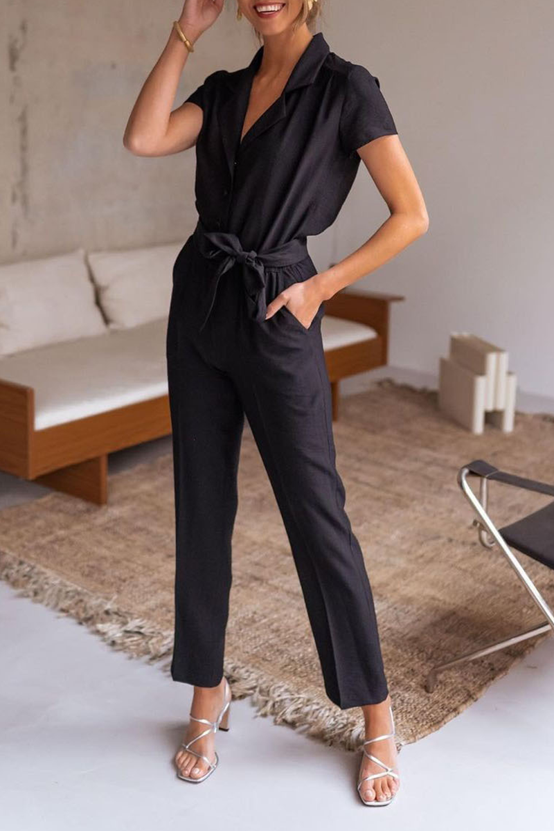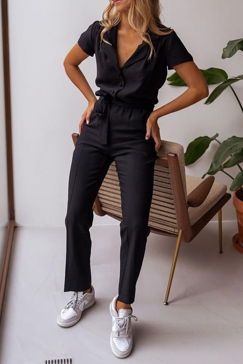 Casual Solid Split Joint Turndown Collar Regular Jumpsuits