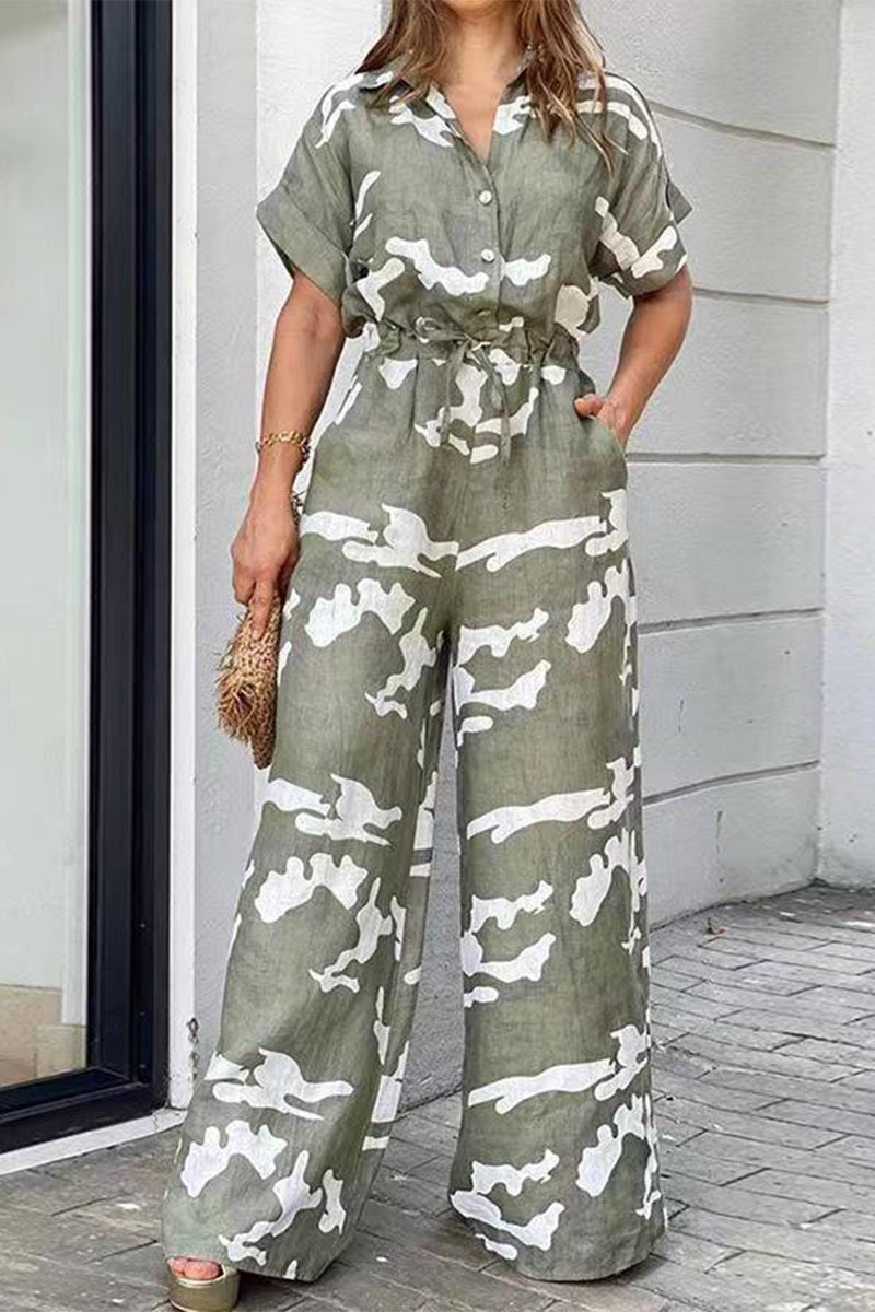 Casual Street Print Patchwork Frenulum Turndown Collar Regular Jumpsuits