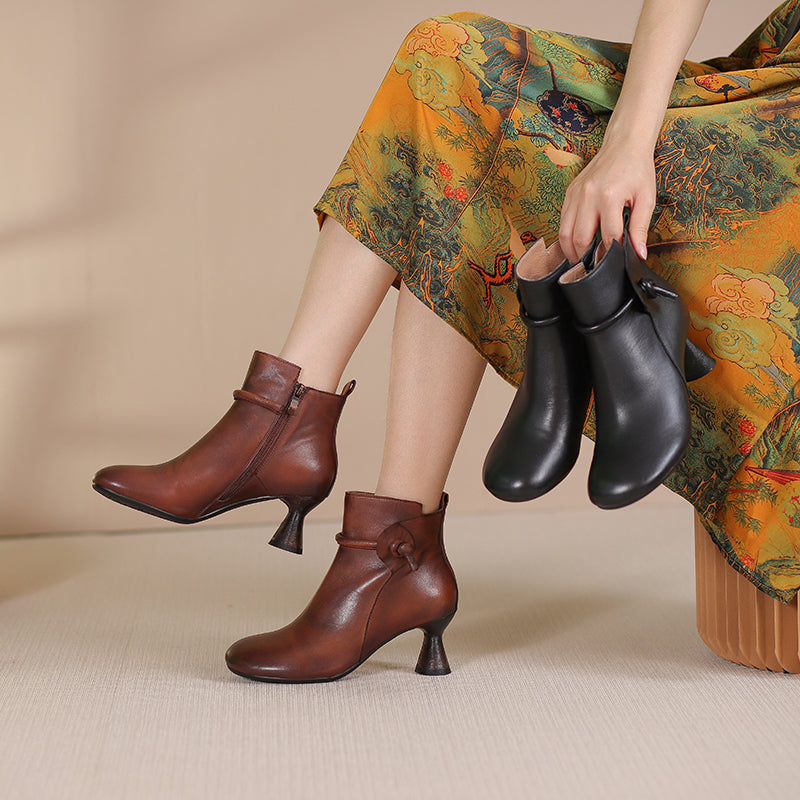Handmade Soft Leather Kitty Heel Ankle Boots For Women Retro Round Toe Side Zipper in Coffee/Black