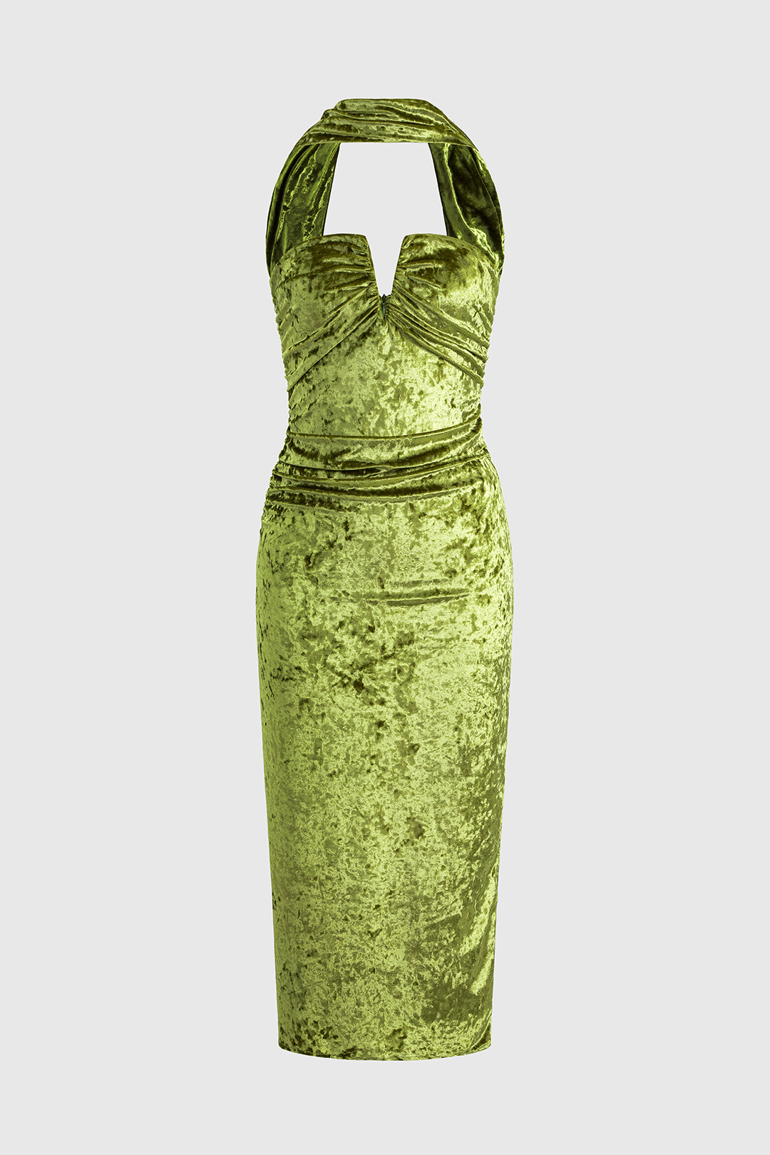 Velvet Ruched Halter Neck Backless Sleeveless Midi Dress