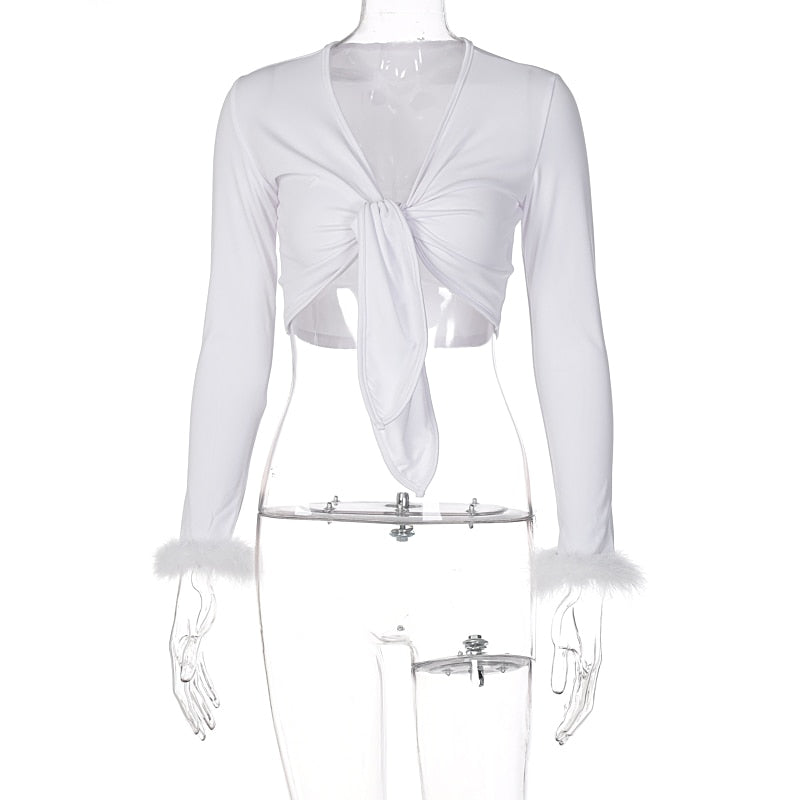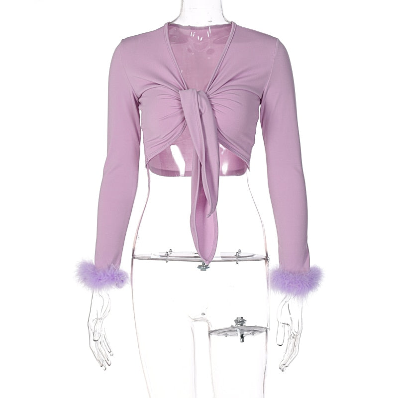 Introducing the Our First Love Crop Top. designed with a solid pattern and long sleeves. With feather decoration details. this top is both stylish and versatile. Perfect for any occasion. you can trust this high-quality crop top to make a lasting impression.