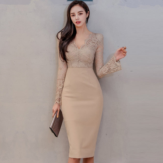 Having a fashionably stylish look is easy when you wear this midi-length dress. A flare sleeve design making you stand out from the crowd. The material on the bodice is made of lace fabric.