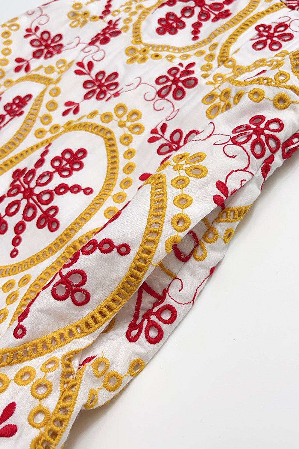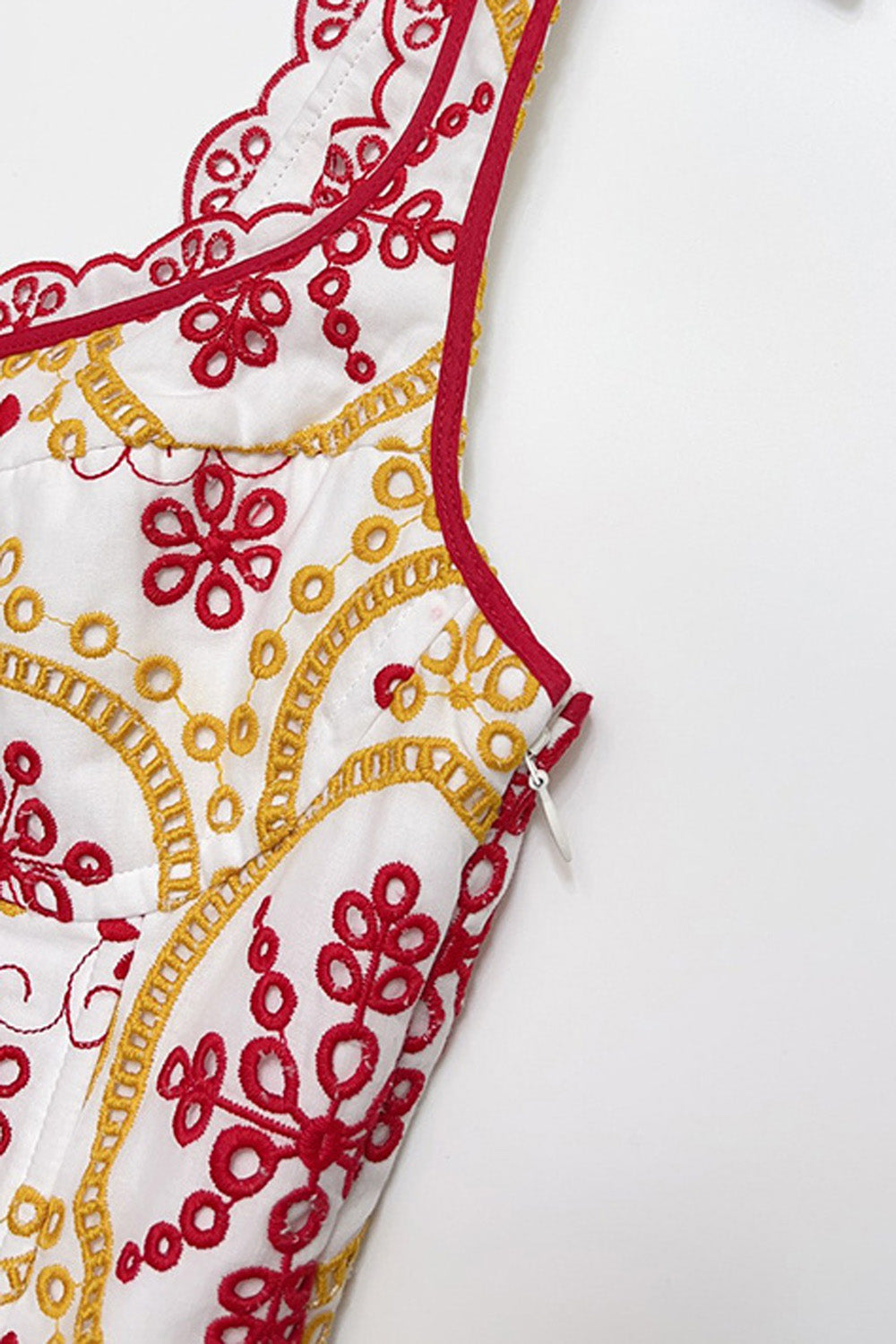 This stylish midi dress is ideal for any occasion. It features a patterned design. an irregular hem. and Spanish-inspired embroidery. The straps and square neckline complete the look. Perfect for adding a unique touch to any wardrobe.