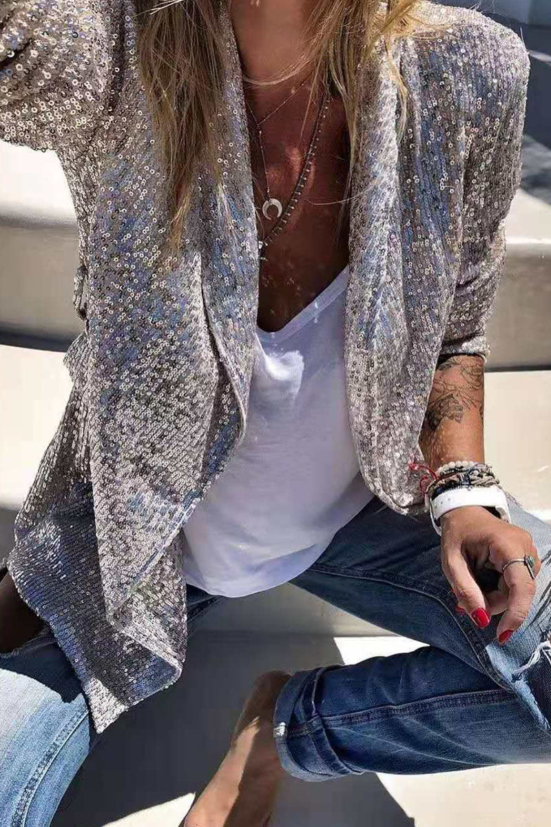 Sexy Solid Sequins Patchwork Turn-back Collar Outerwear(3 Colors)