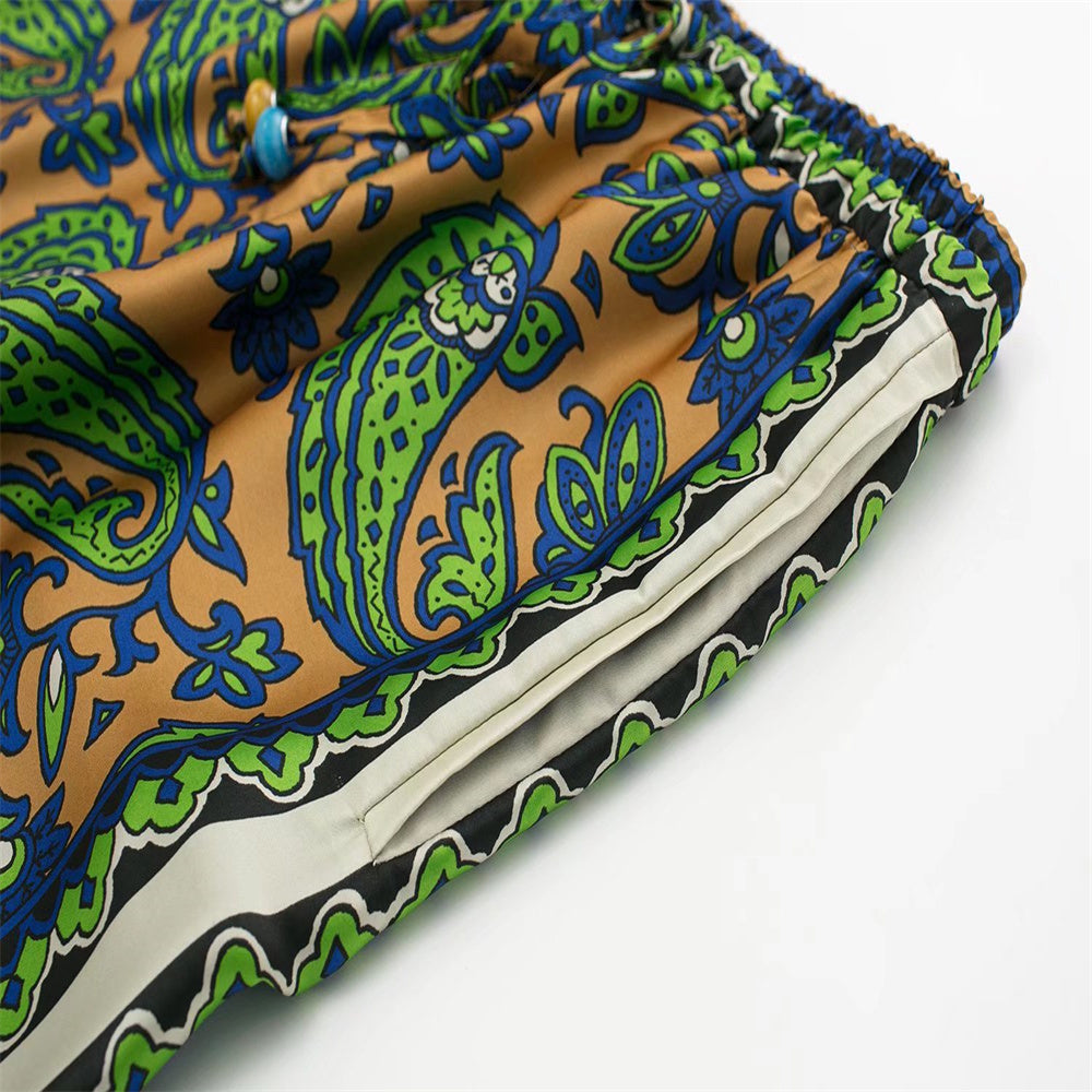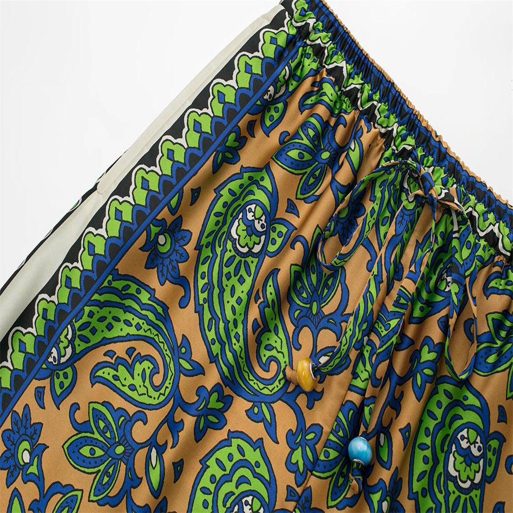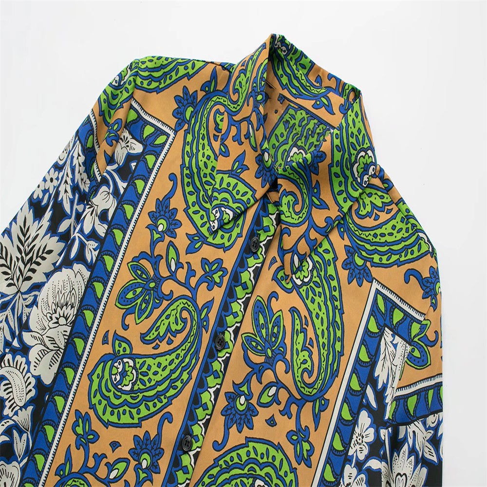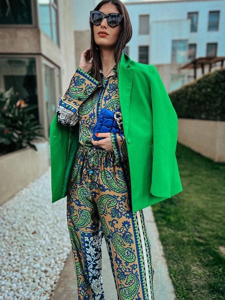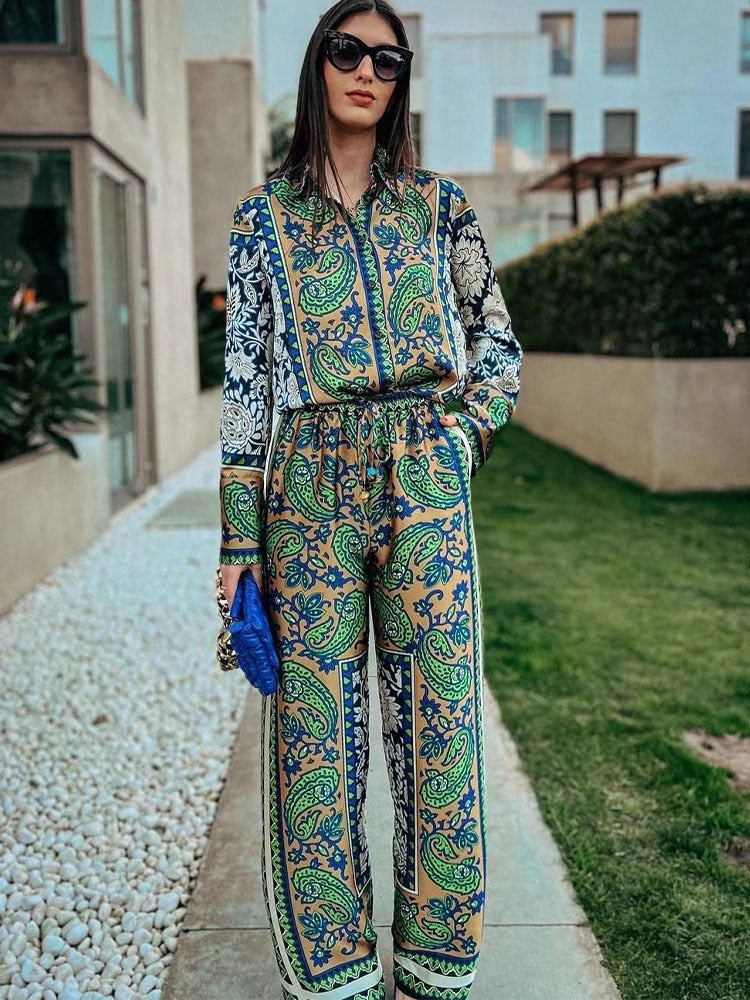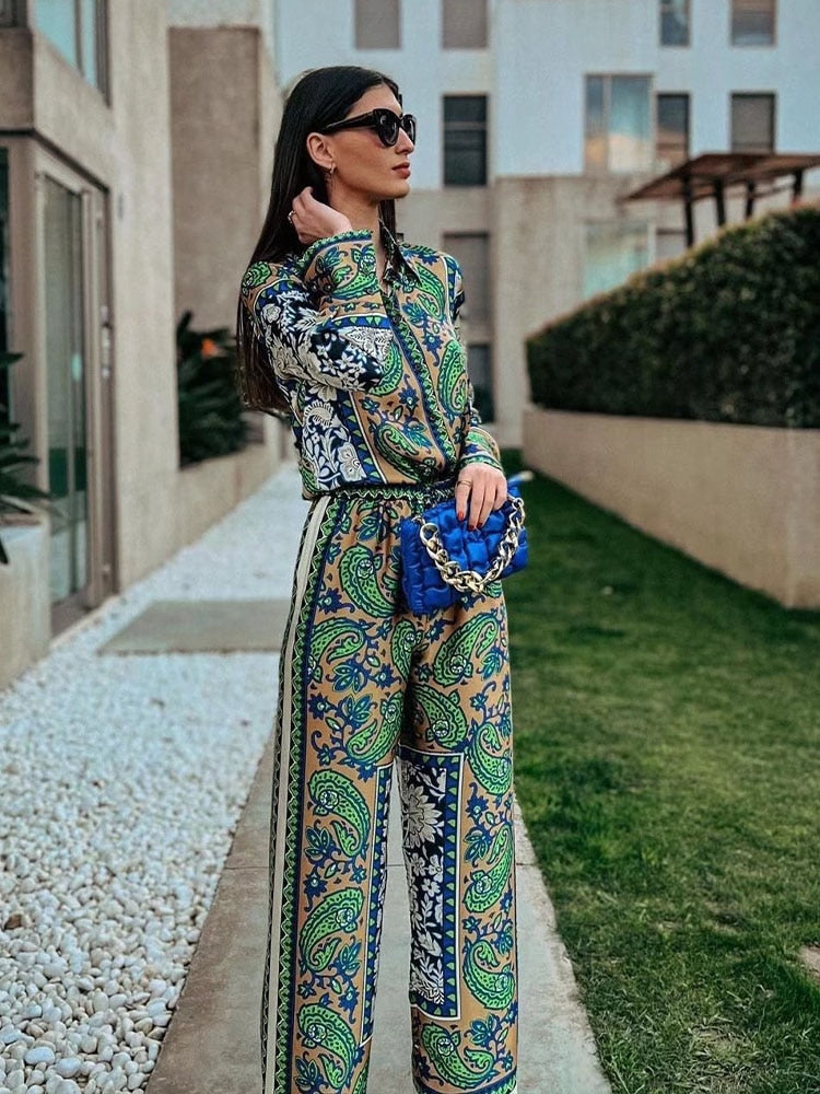 Women's polyester pants set includes a shirt and long pants. The shirt is a loose-fitting top with a geometric printed pattern. The long pants are a matching geometric print. Perfect for a casual day.