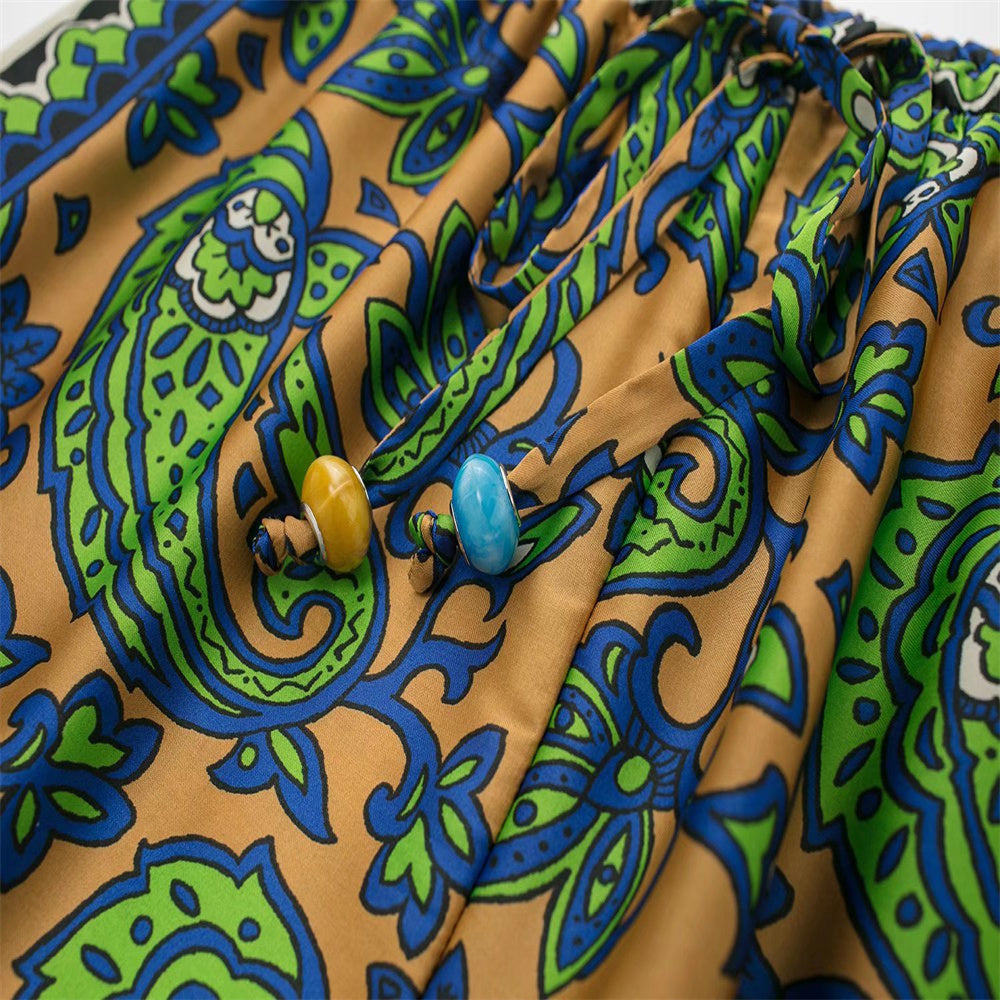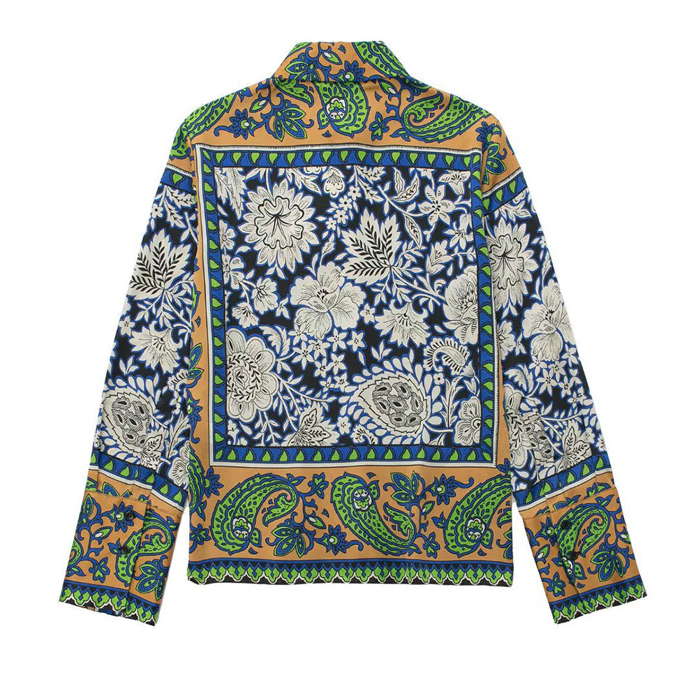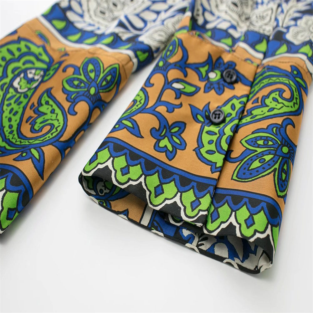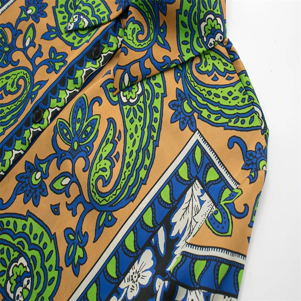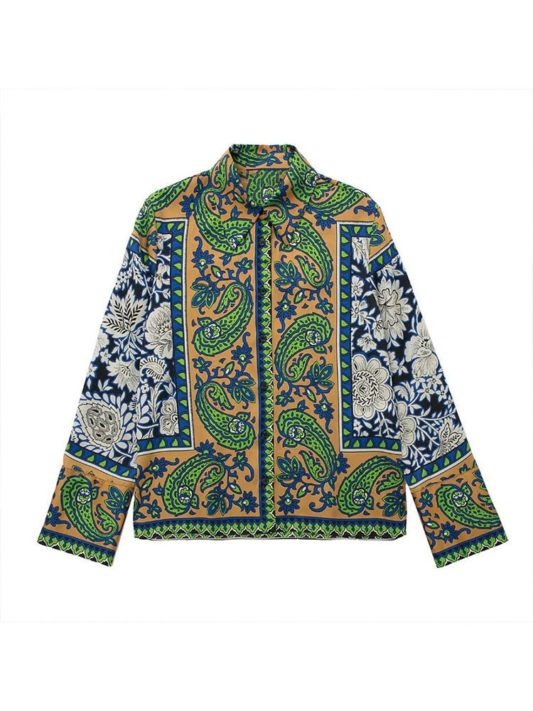 Women's polyester pants set includes a shirt and long pants. The shirt is a loose-fitting top with a geometric printed pattern. The long pants are a matching geometric print. Perfect for a casual day.