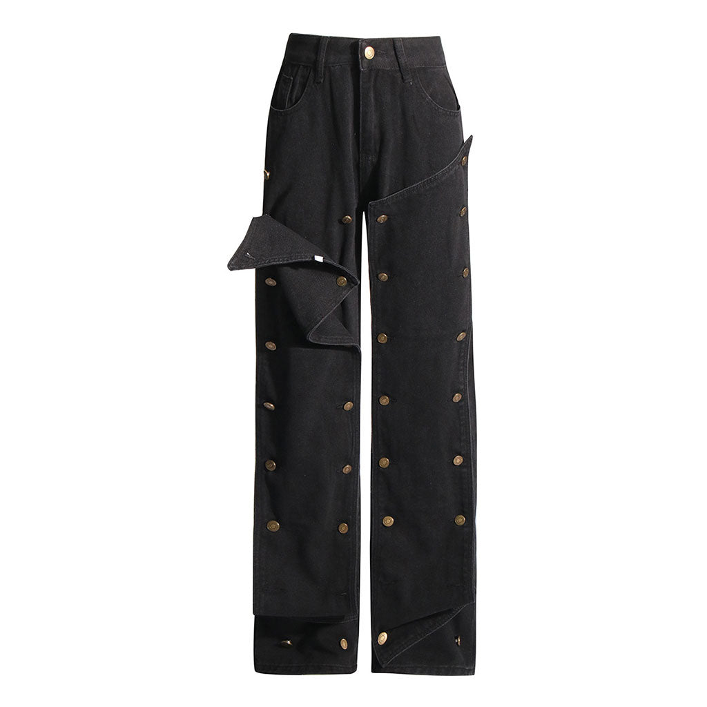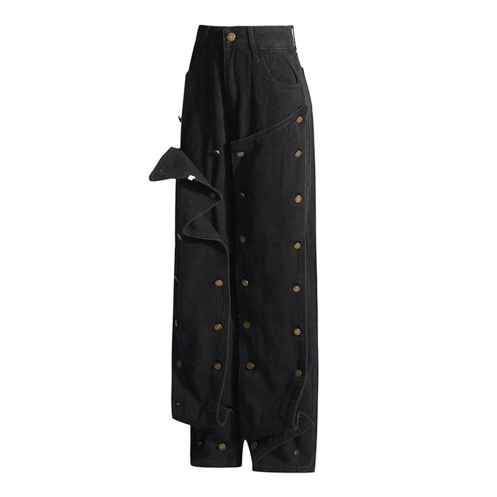 Transport yourself back in time with our designer Jeans. a nostalgic nod to retro fashion with a modern twist. What sets these retro jeans apart is the detachable layered design with vintage-inspired metal buttons to the front. adding a unique and playful element to the traditional silhouette. The straight leg silhouette offers a flattering fit that elongates the legs and complements a variety of body shapes. Whether dressed up with heels for a night out or paired with sneakers for a casual daytime look. these unique jeans are versatile enough to take you from day to night with ease.